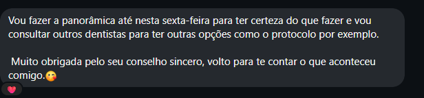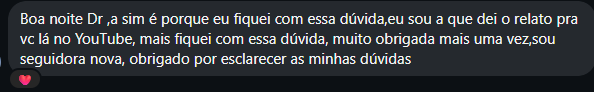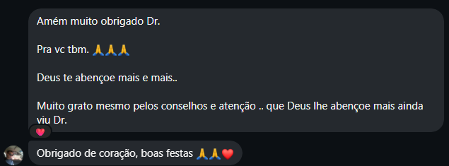 Obrigada por sanar minhas dúvidas ,de grande Vália, informação coesa, que passa uma seguridade para o paciente. Moro no RS... Sem palavras para agradecer.
